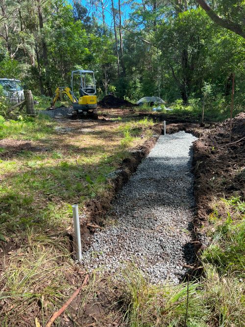 As groundwater accumulates in the adjacent soil, it naturally flows into the gravel trench, enters the perforated pipe, and is redirected to a designated safe discharge point. This system operates efficiently below ground level without visible grates or channels, which is particularly beneficial in clay-heavy soils, commonly found in Wollongong and the greater Illawarra region.